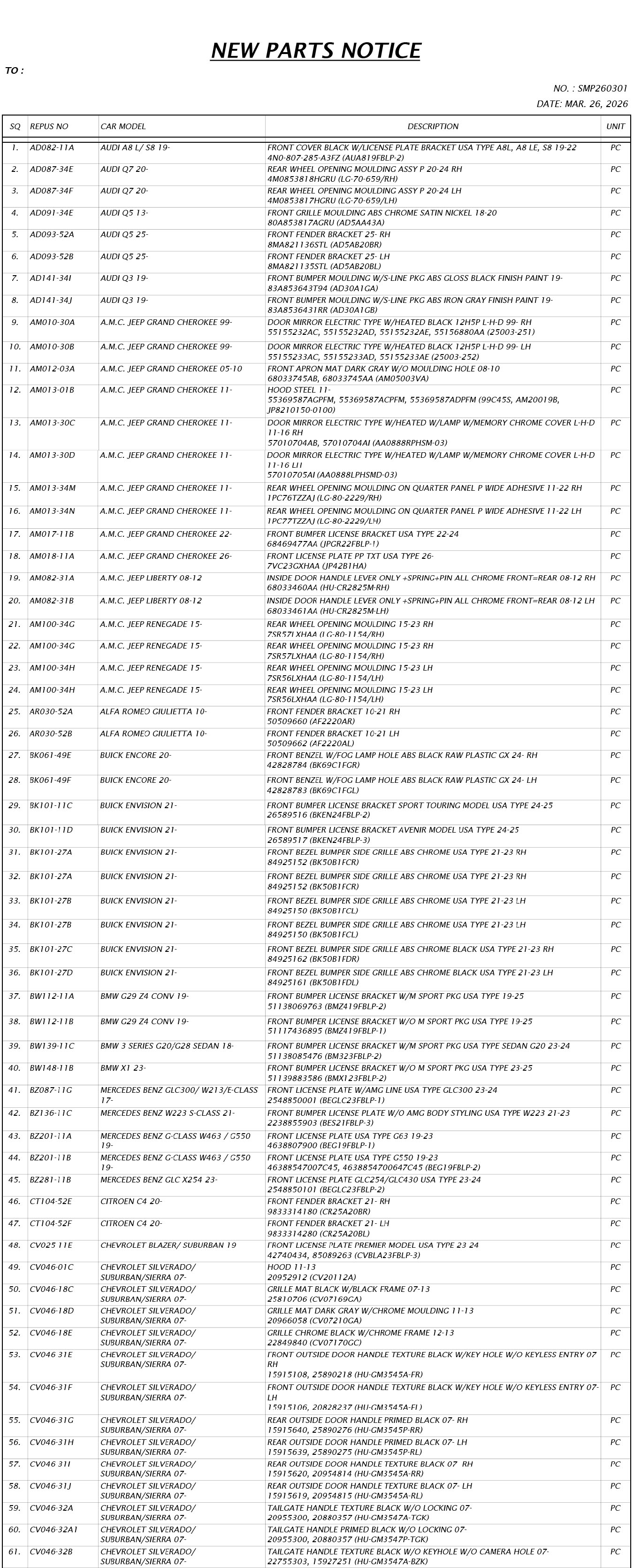 NEW PARTS NOTICE (Mar. 2026)